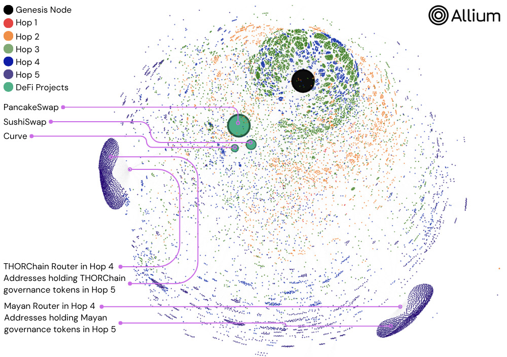 Allium’s cross-chain data enables data wizards to track and visualize every interaction within five layers of transactions on Ethereum and the analysis involved: