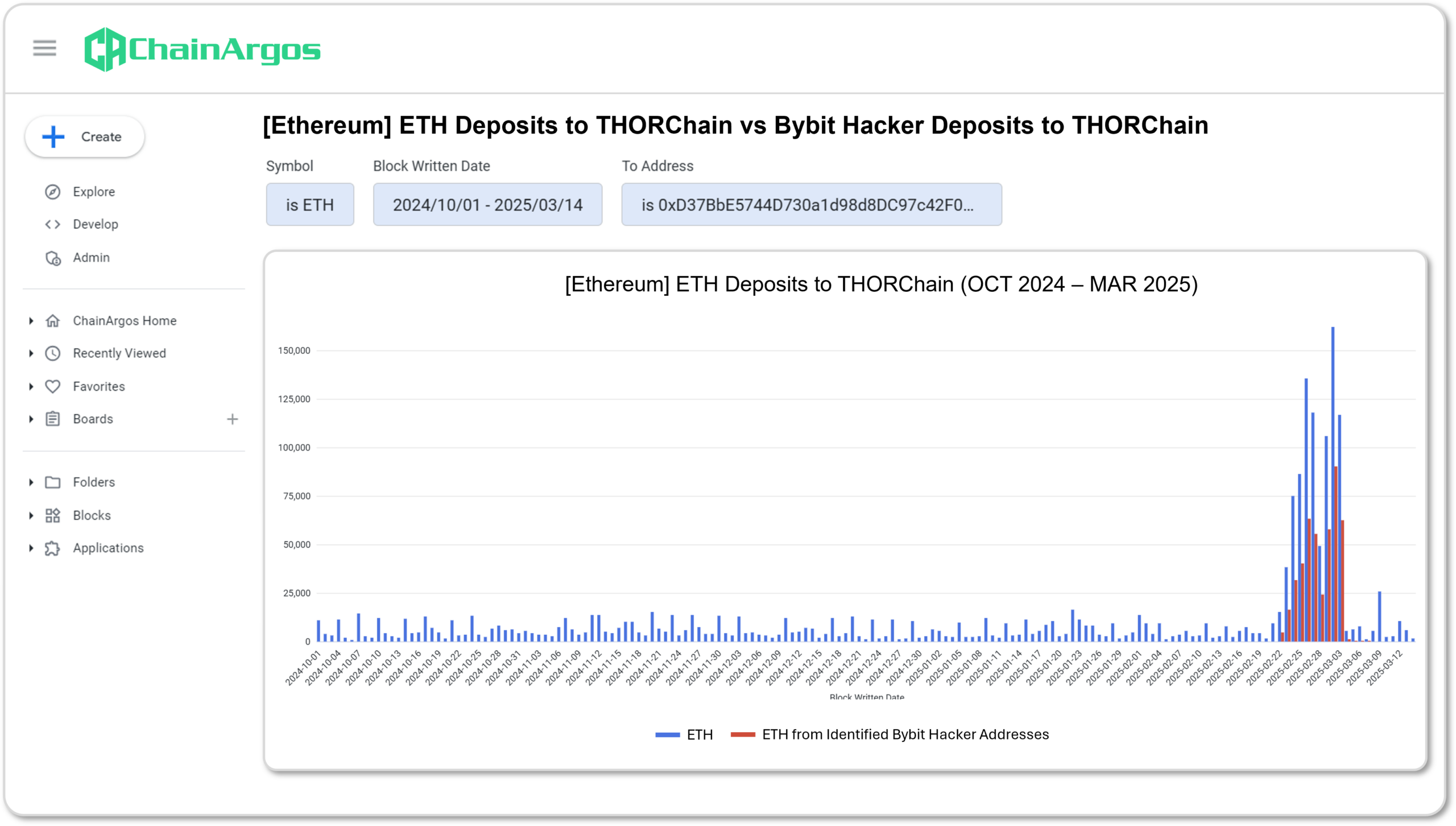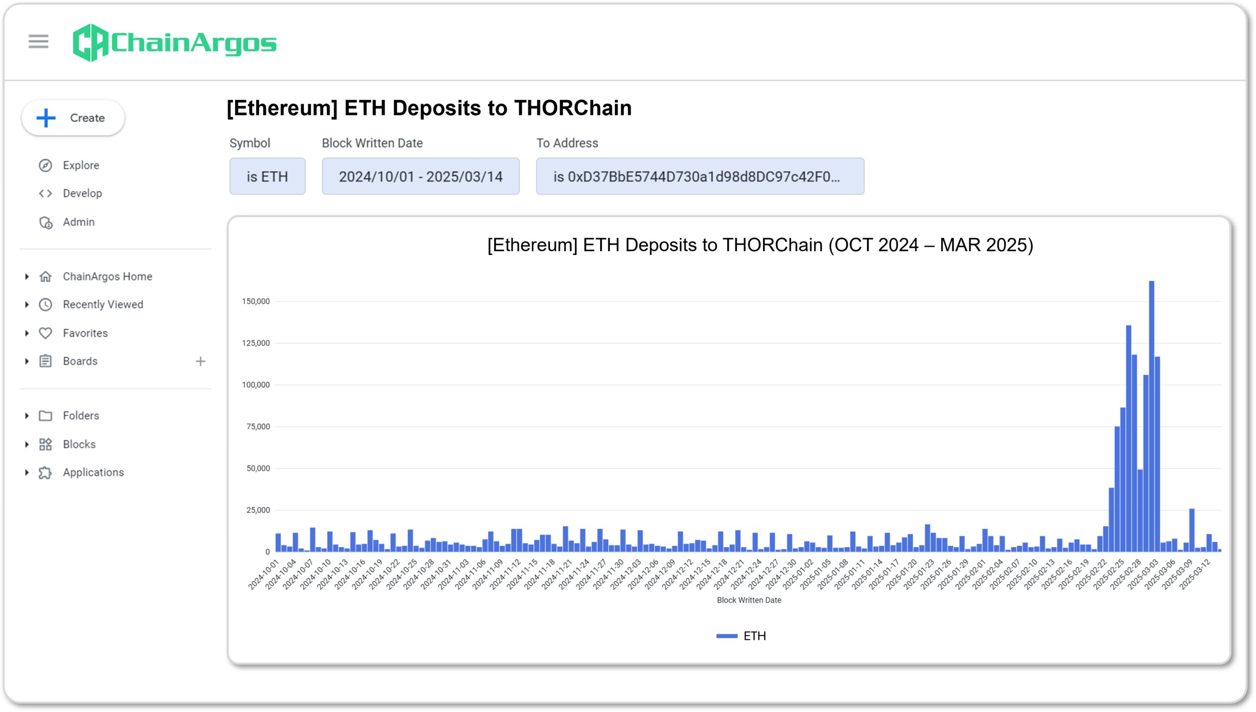 Figure 4. ETH deposits to THORChain from October 2024 through March 2025. Notice the significant rise in ETH deposits immediately following the Bybit hack. (Source: ChainArgos)