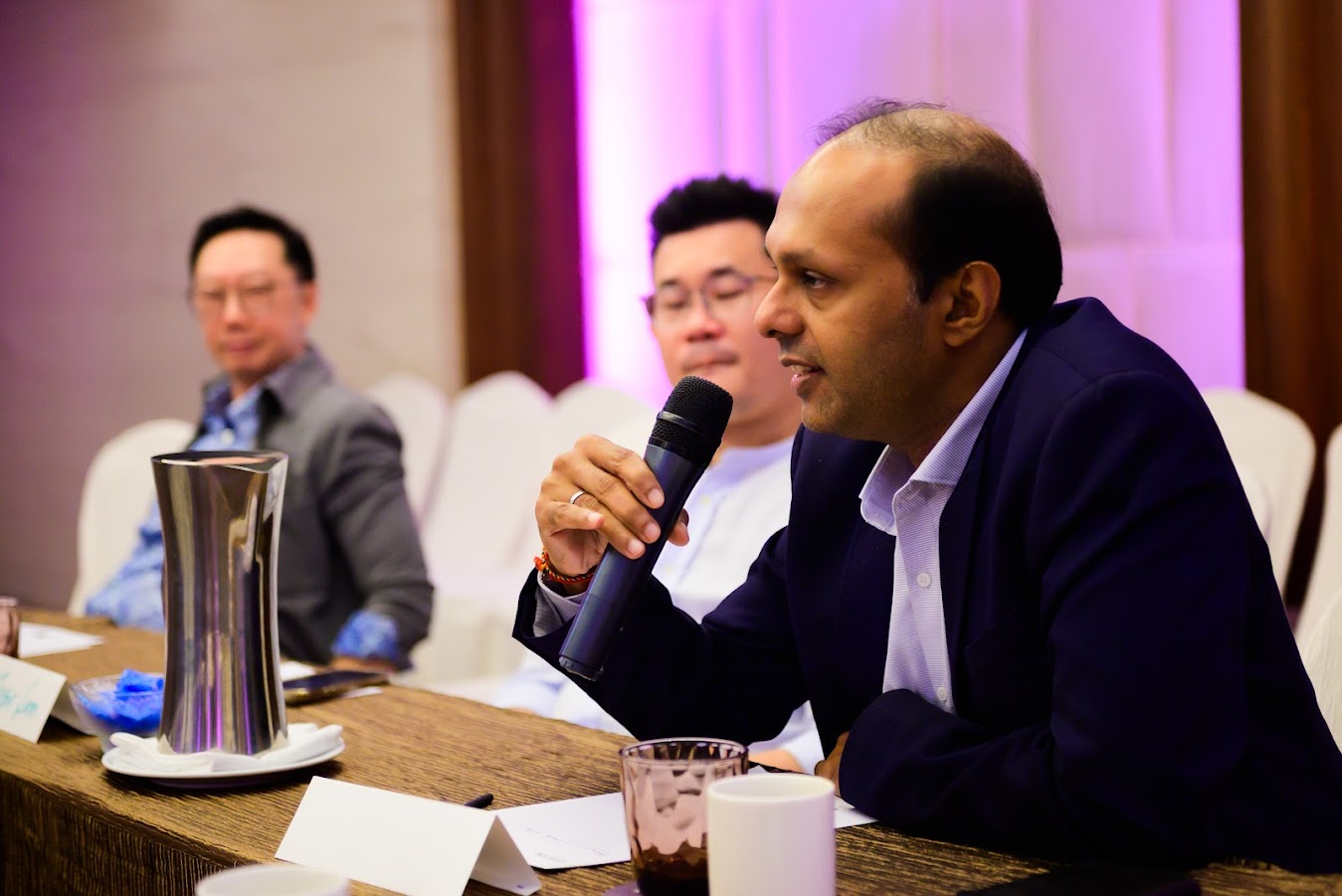 Of Counsel and Former Nominated Member of Parliament for Singapore, Mahdev Mohan (holding microphone) speaks at one of the closed-door roundtables at the inaugural Digital Assets Policy Roundtable in Singapore.