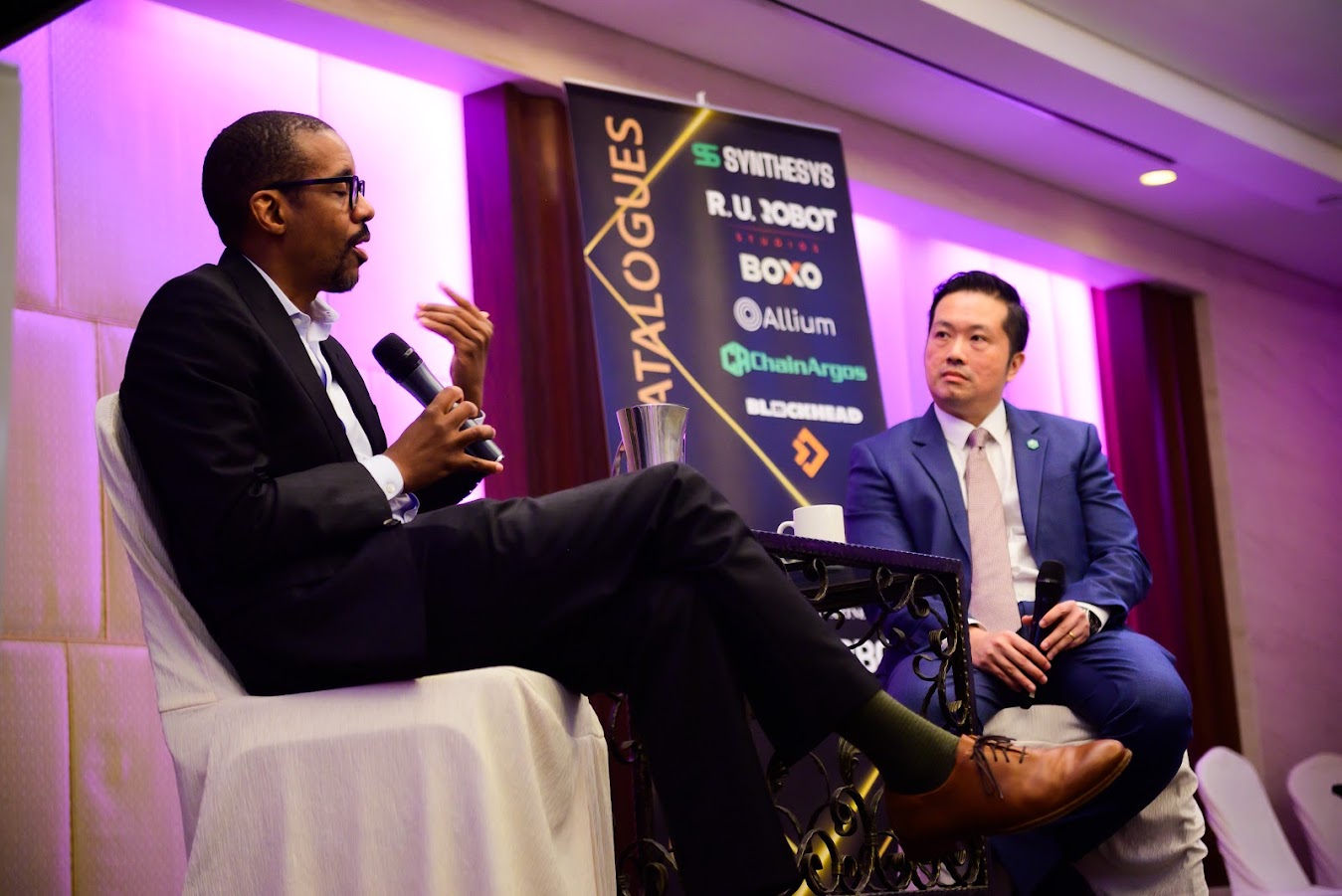Georgetown University Law Professor Crhis Brummer shares with delegates the finer legal points on the legal definition of a DAO in a fireside chat with ChainArgos General Counsel Patrick Tan (right).
