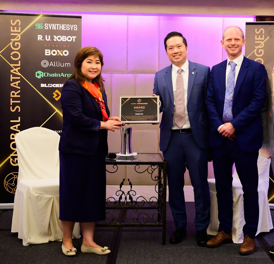 ChainArgos General Counsel Patrick Tan (center), presenting a lifetime achievement award on behalf of Global Stratalogues to Global Blockchain Business Council CEO, Sandra Ro (left), with Global Stratalogues CEO Oscar Wendel (right).