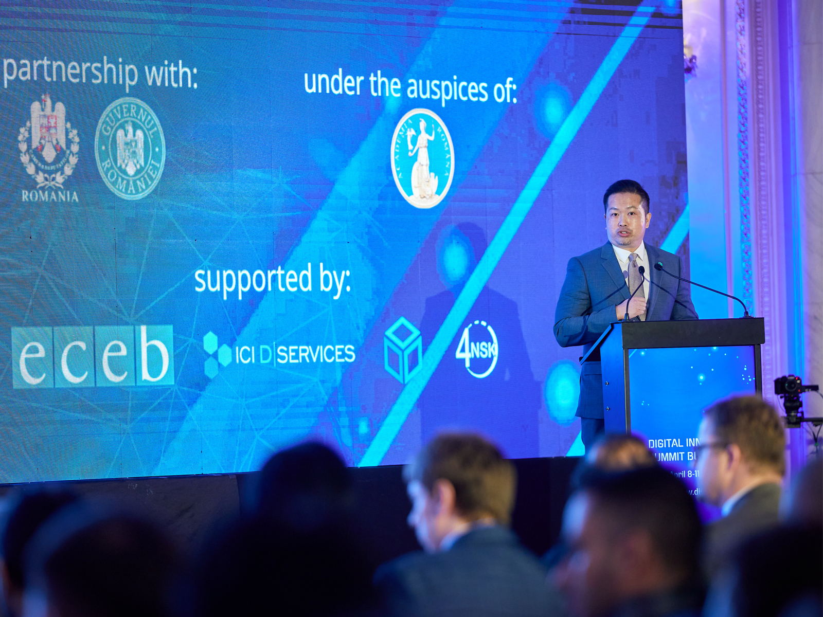 ChainArgos General Counsel Patrick Tan addresses delegates at the Palace of the Parliament, stressing the need for establishing clear standards for blockchain intelligence.
