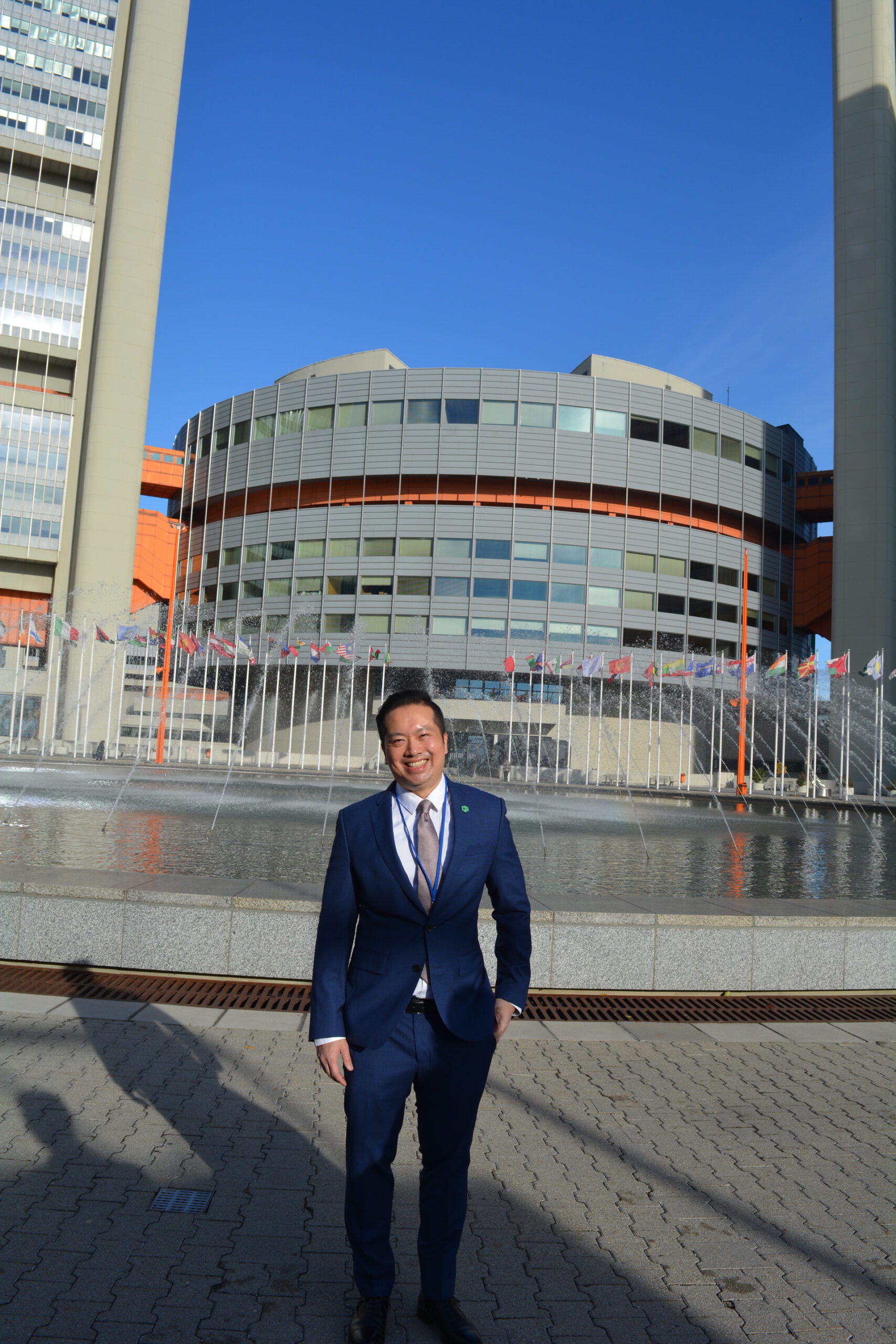 ChainArgos General Counsel Patrick Tan stands at the plaza of the historic United Nations Office in Vienna, Austria, one of the four major office sites of the United Nations where numerous different UN agencies have a joint presence, and the venue for the 9th Global Conference on Criminal Finances and Cryptoassets