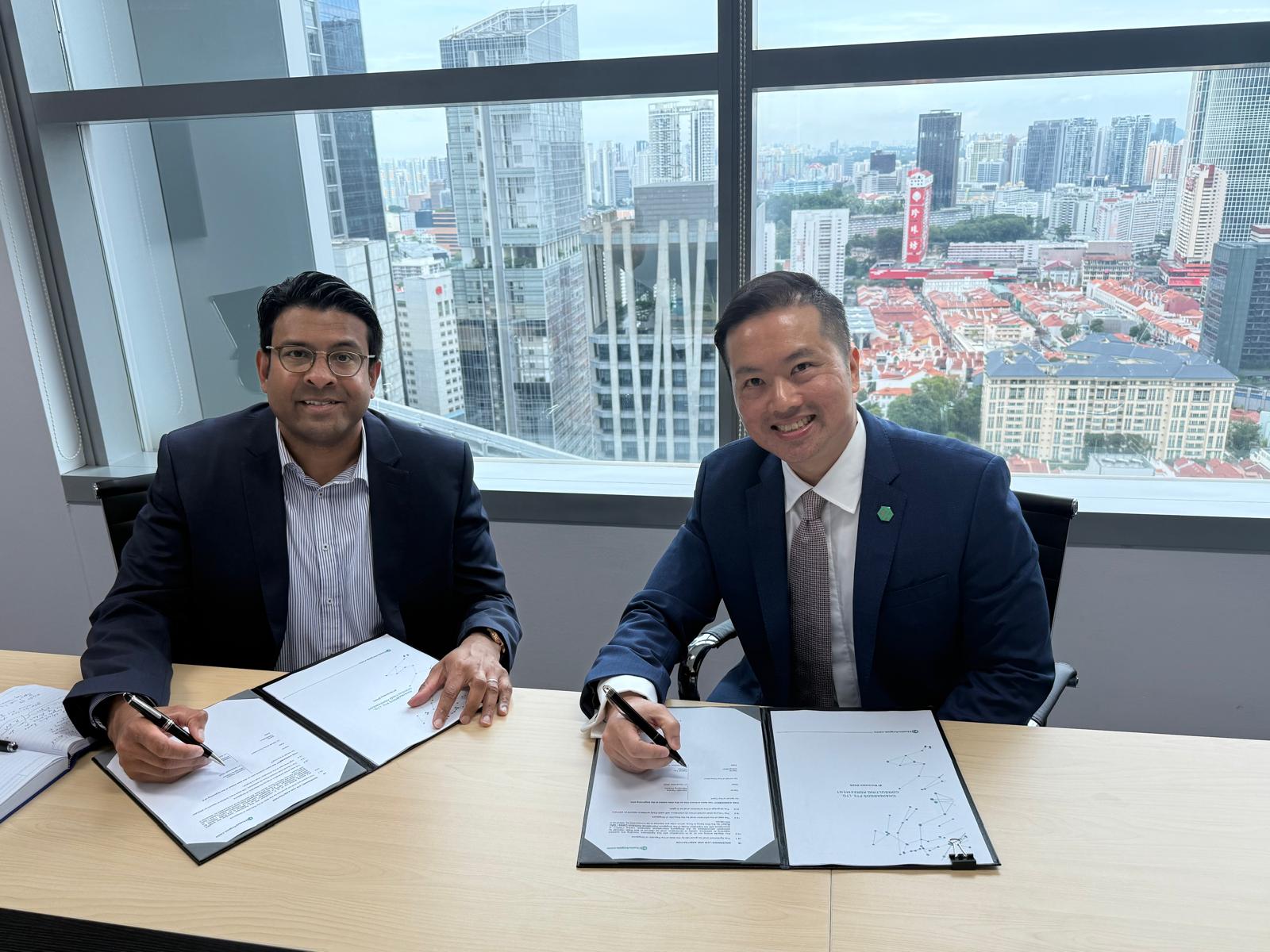 KGP Legal Managing Director Kenneth Pereire (left) and ChainArgos General Counsel Patrick Tan (right) holding up the signed strategic alliance agreement which facilitates the joint delivery of integrated blockchain intelligence and legal solutions, with a single point of engagement and billing through KGP Legal.